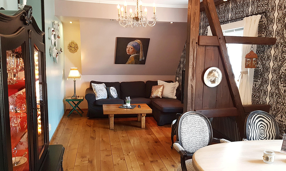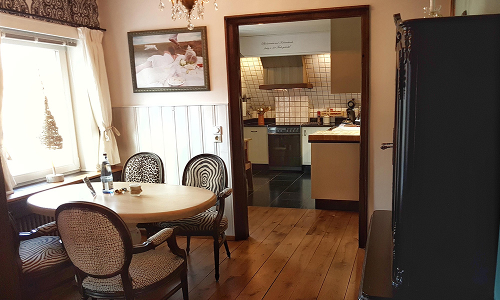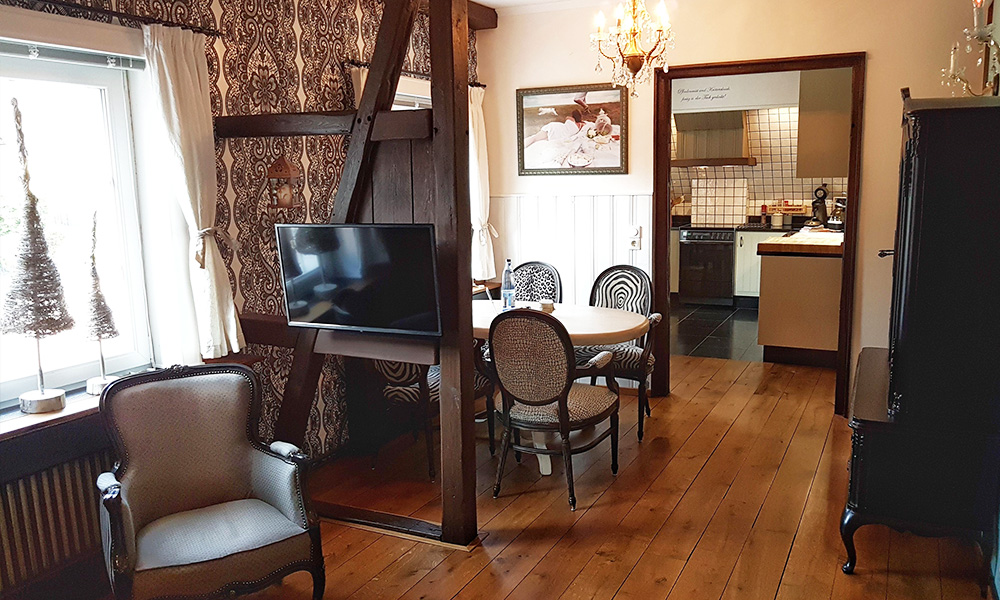 Im Wohnzimmer sowie in der Küche lässt sich sehr gut die alte Bauweise – echter Fachwerk-Stil – erkennen, in dem unser Haus vor über 100 Jahren gebaut wurde.