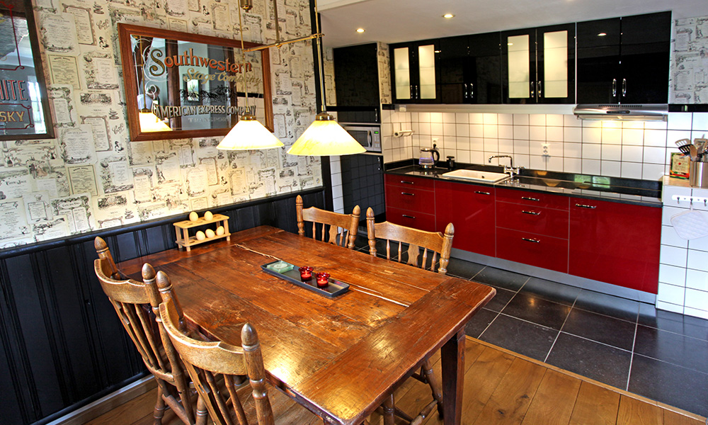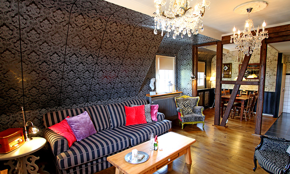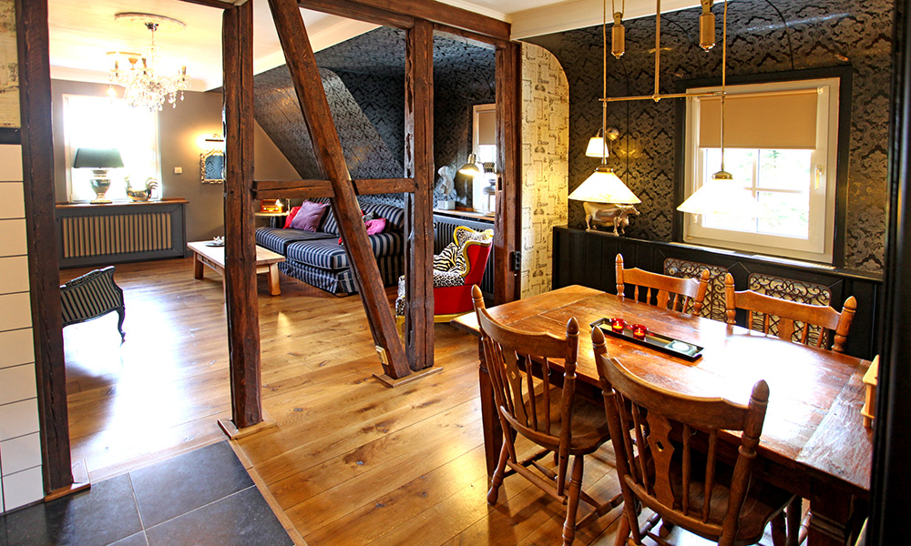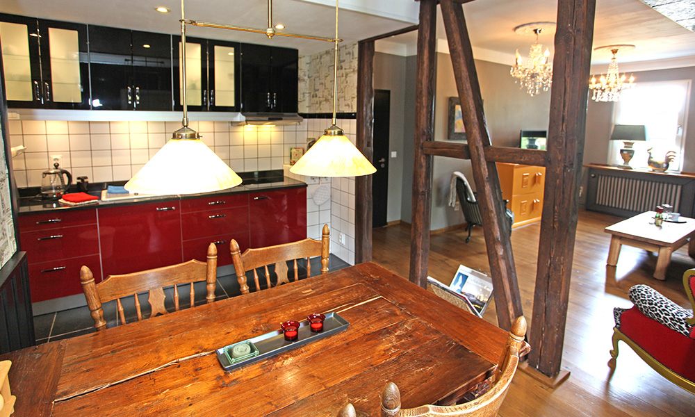 Im Wohnzimmer sowie in der Küche lässt sich sehr gut die alte Bauweise – echter Fachwerk-Stil – erkennen, in dem unser Haus vor über 100 Jahren gebaut wurde.